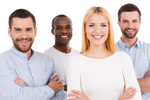 Happy to be a team. Four happy young people in smart casual wear looking at camera while bonding to each other and standing against white background
